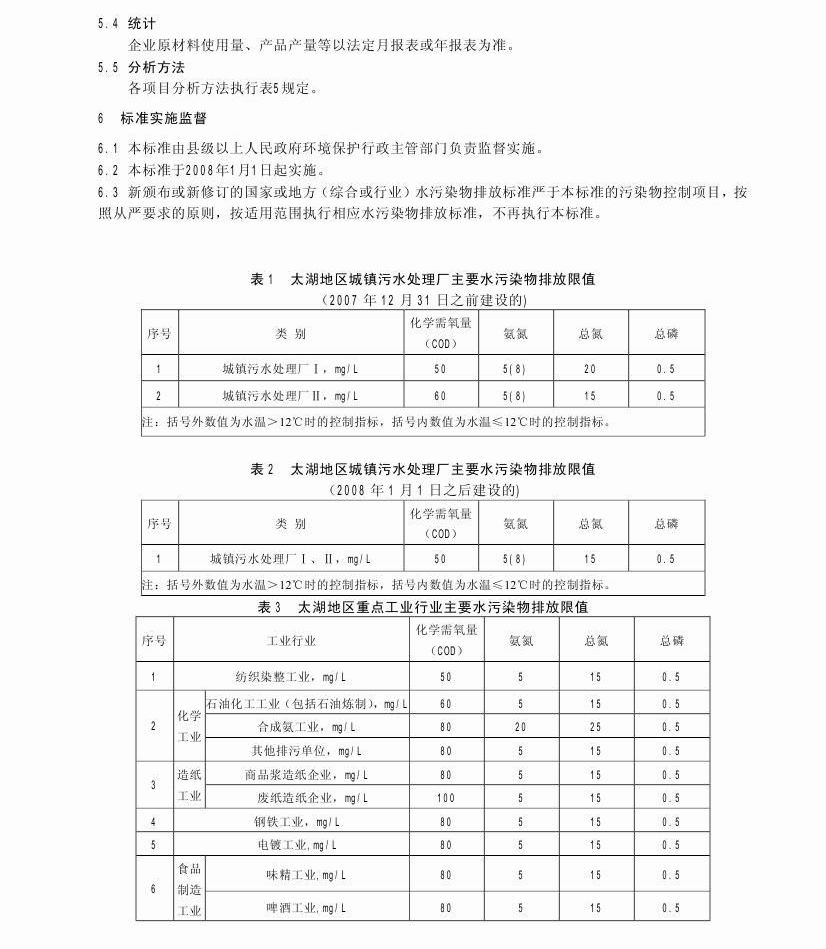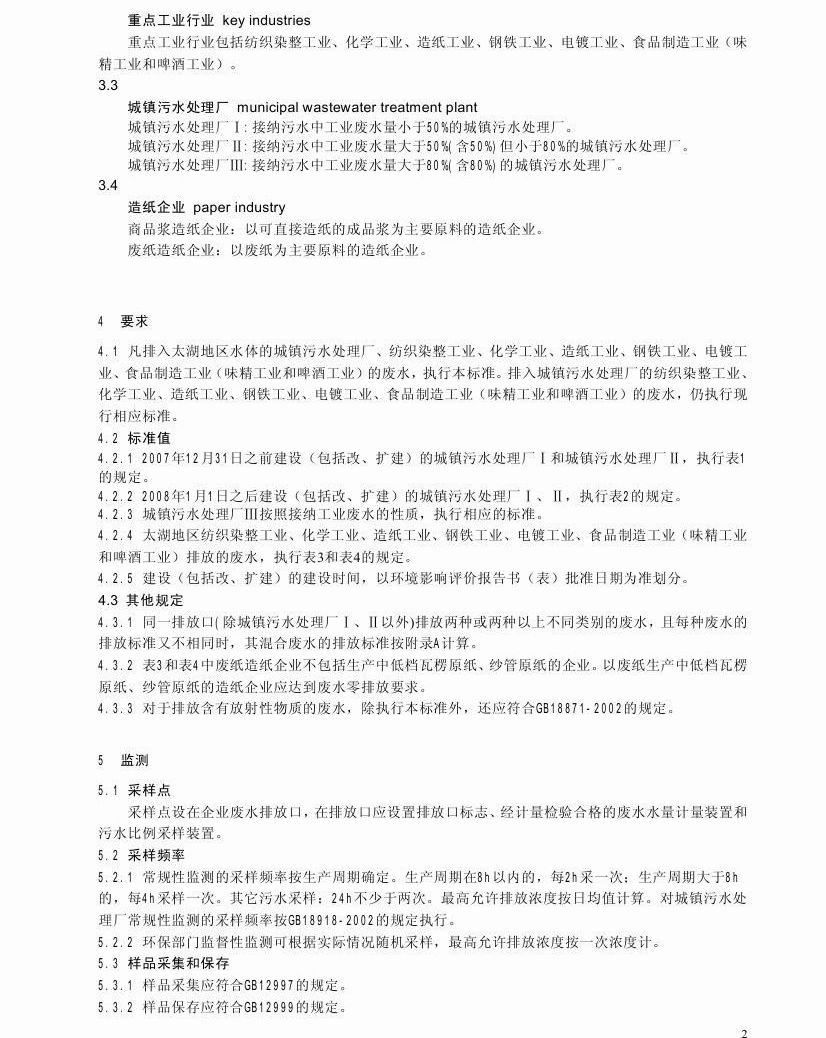 太湖地区城镇污水处理厂及重点工业行业主要水污染物排放限值